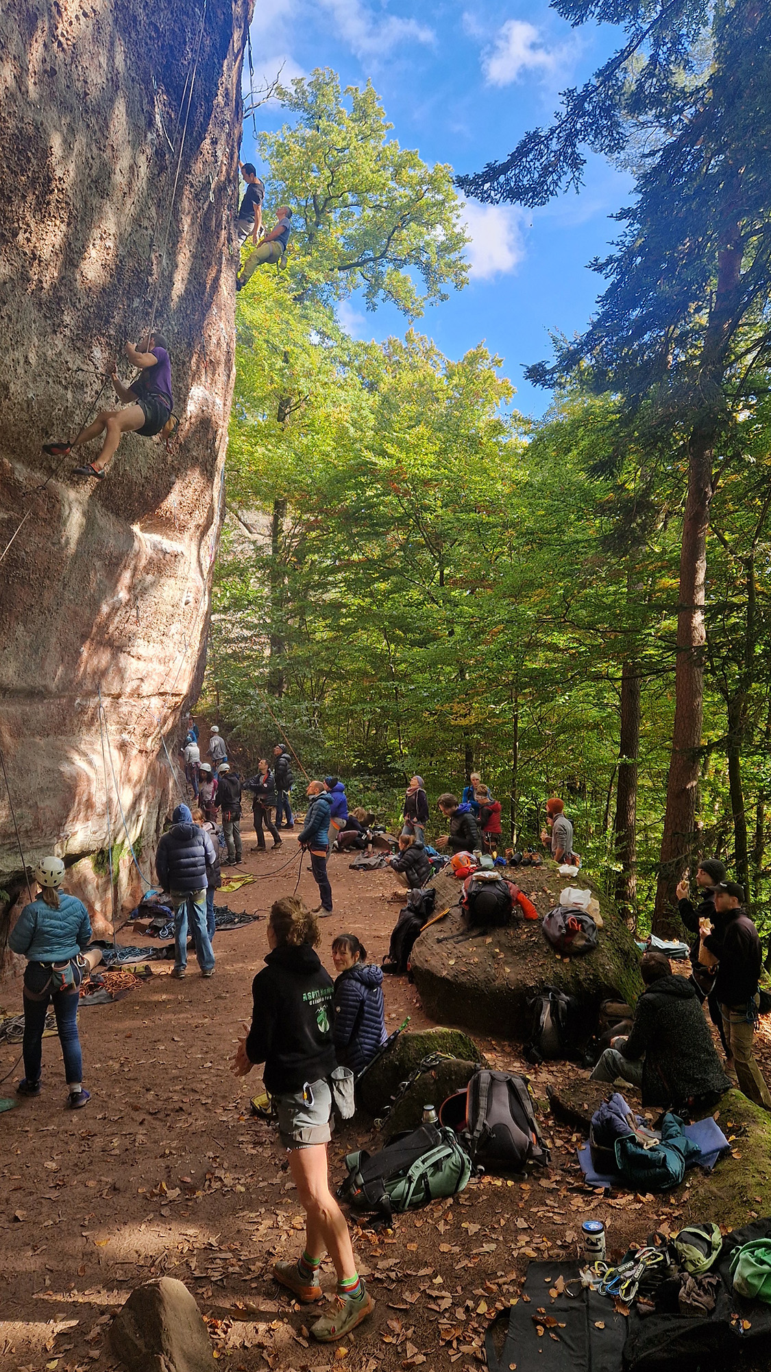 Certains jours des tickets sont distribués pour organiser la bataille mais ne métalepse pas qui veut. La voie résiste, les zipettes (de mains essentiellement) se multiplient, et la pince verticale main gauche du départ devient vite l'étalon qui permet de savoir comment se passera la séance. L'humidité gagne du terrain, tandis que l'humilité s'ancre dans le cœur des grimpeurs. En cet fin octobre pourtant, certains sont en bonne voie, mais rares sont ceux qui parviennent à tenir le galet-patate-graal qui signe la fin des difficultés. La fin des difficultés, peut-être, mais pas la fin du combat, loin de là. Les assaillants tombent, inlassablement, les uns après les autres, souvent avant "l'œil" salvateur, parfois… je préfère effacer ce souvenir, d'ailleurs est-ce bien arrivé ?