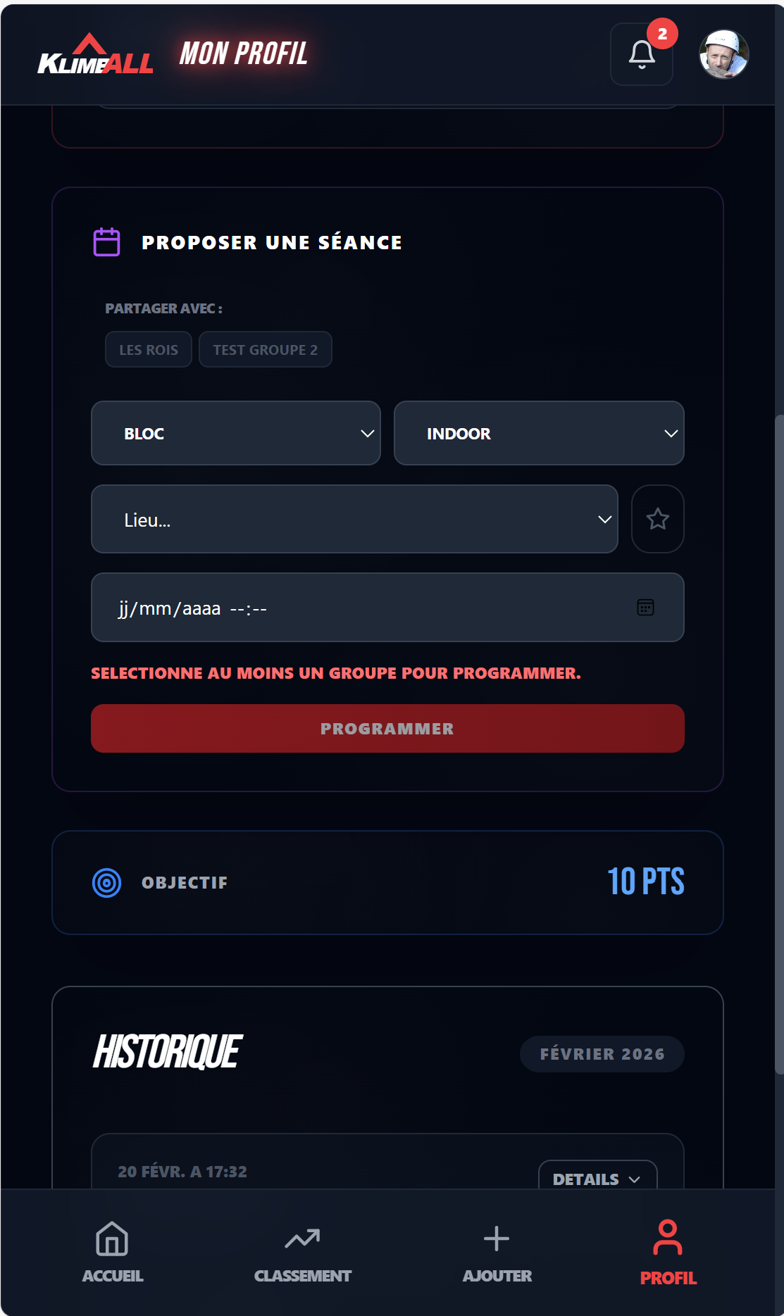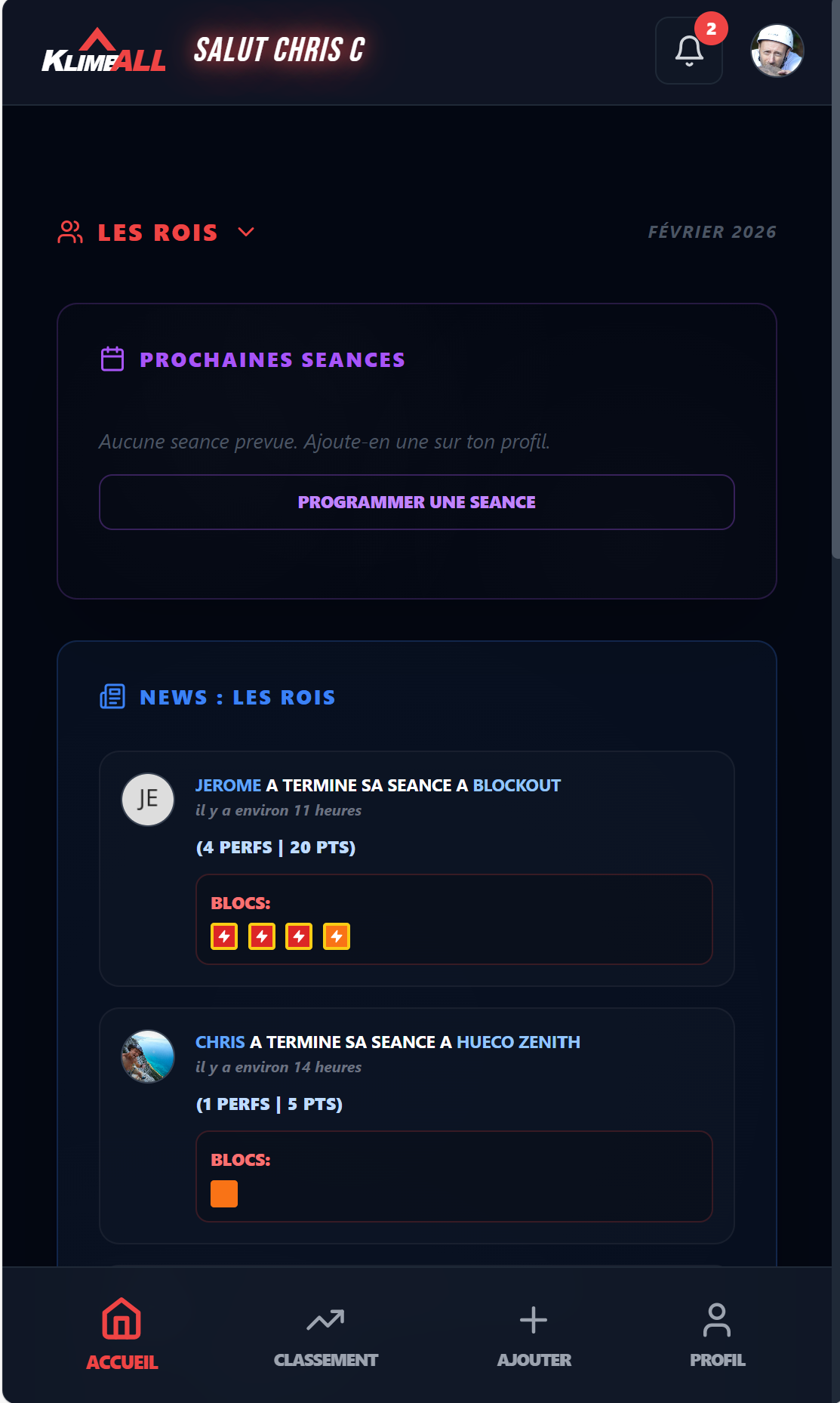 J’ai fini par coder KlimbAll, une petite application (PWA) conçue pour tracker ses perfs, cumuler des points et surtout, se motiver entre potes via un système de groupes.