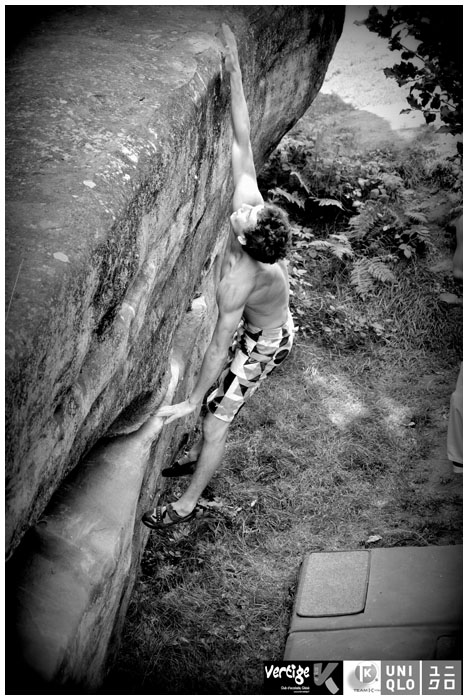 Clément Vernaison dans Picocu 7a bloc (sévère) au Laurenzoboulderfels [Secteur Banc des géants]